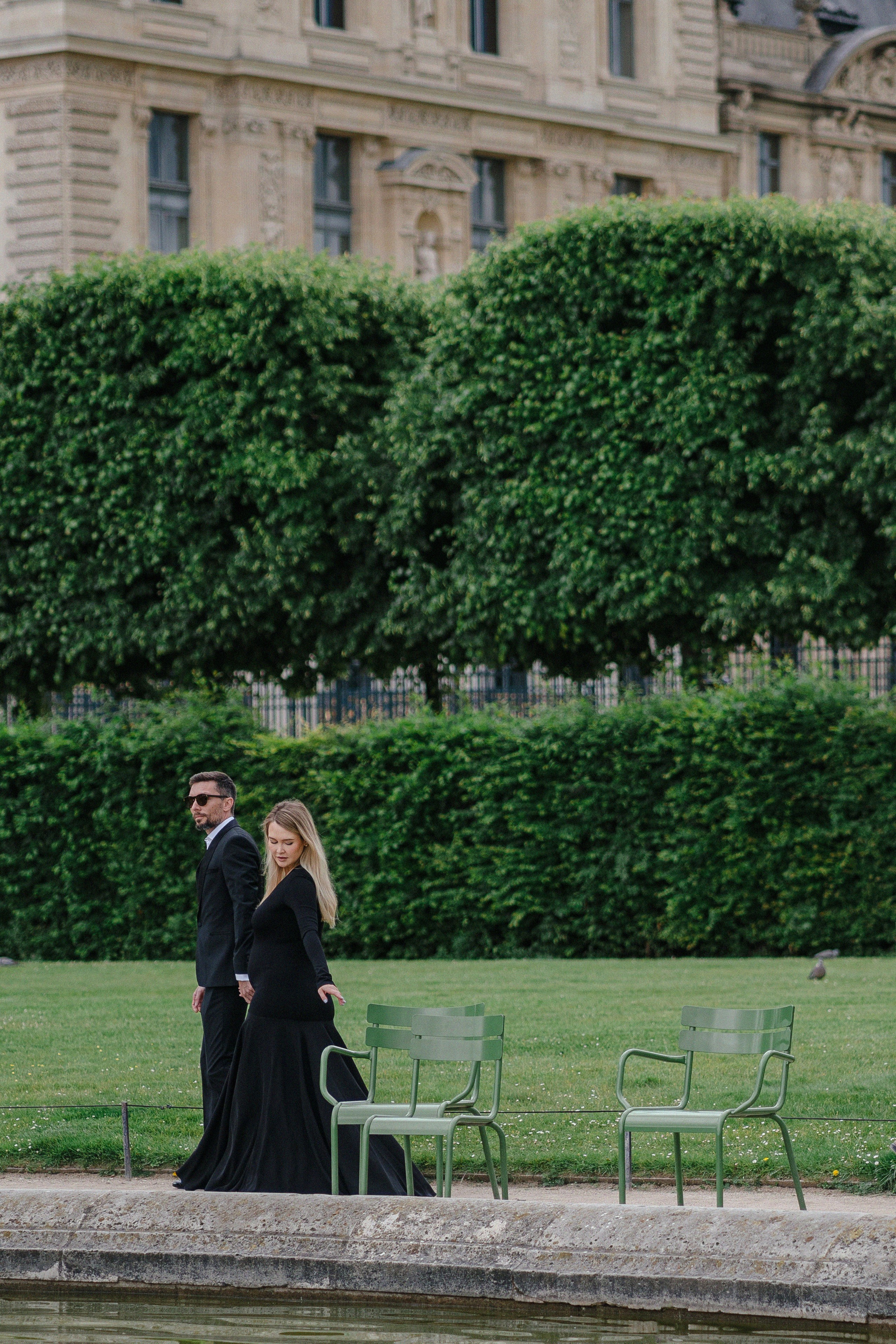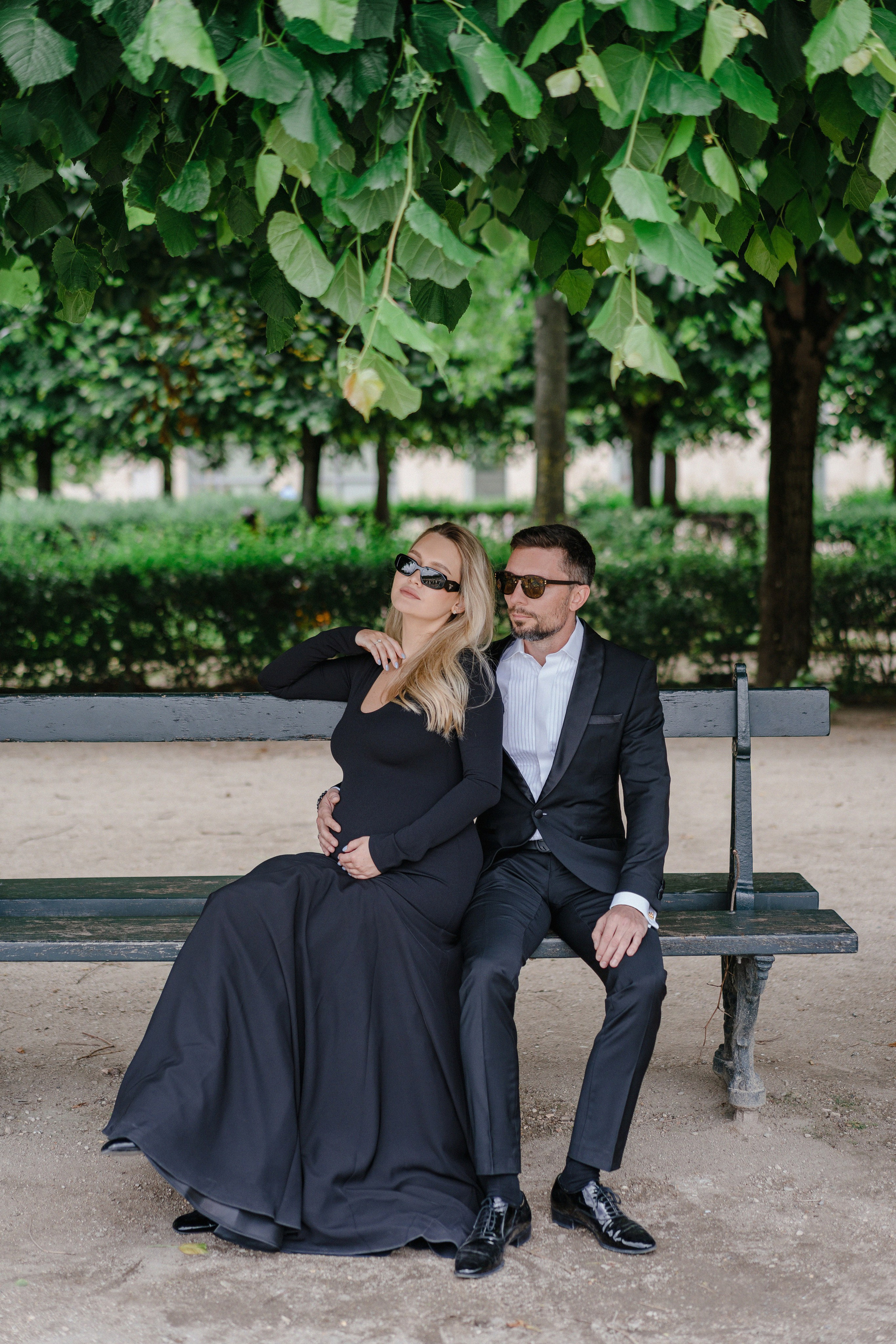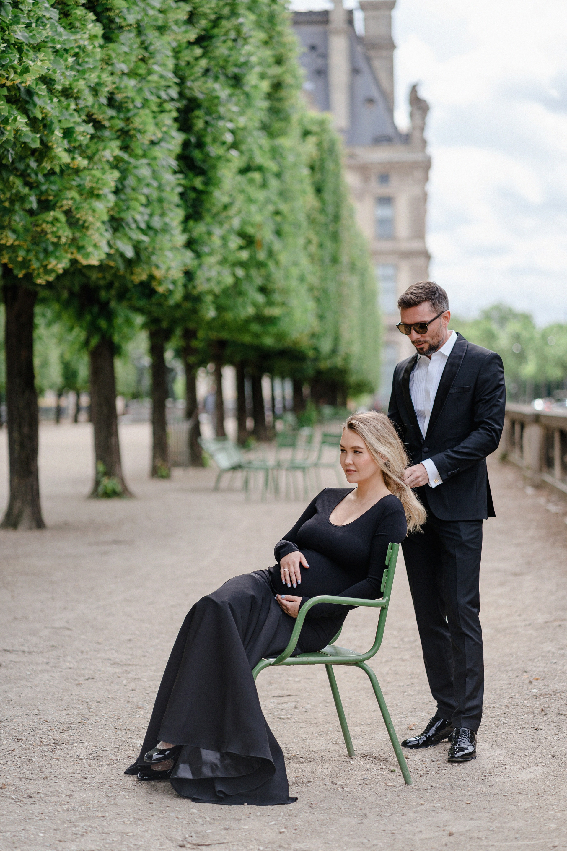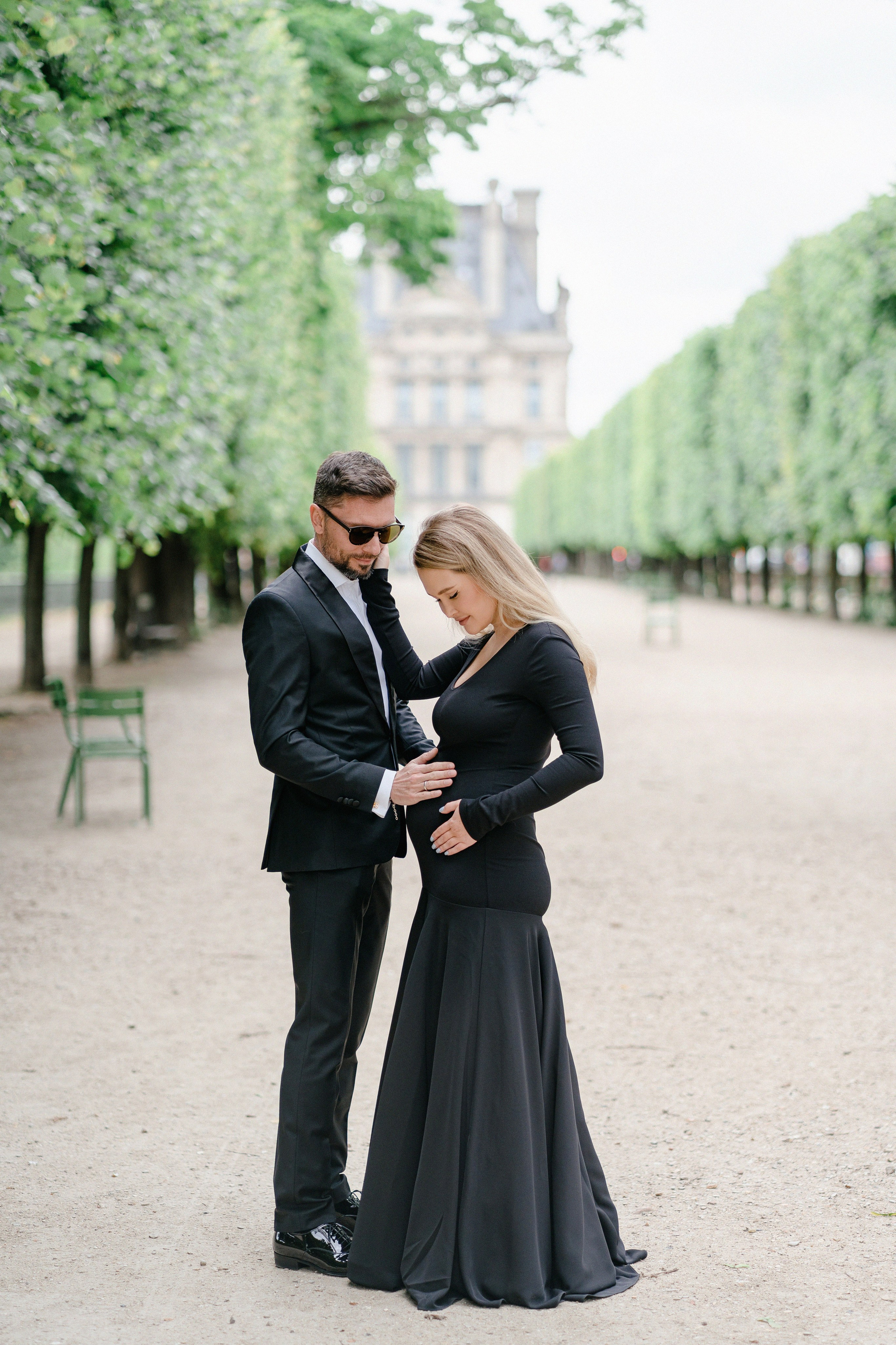 Майская съемка в саду Jardin des Tuileries — яркая зелень, мягкий свет и элегантная лаконичность силуэтов в черном. Особенное время в ожидании нового члена семьи в особенном для этой пары городе.