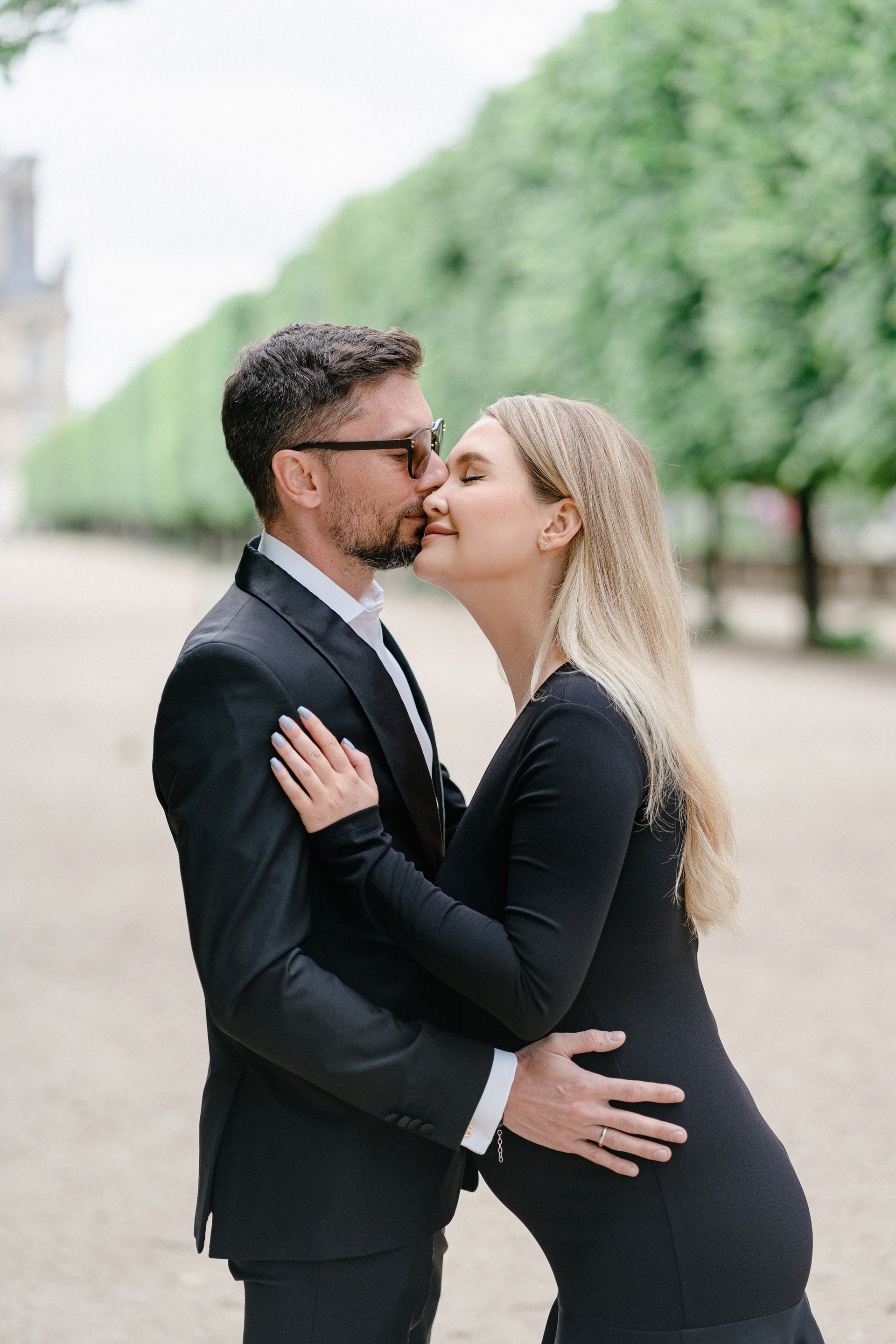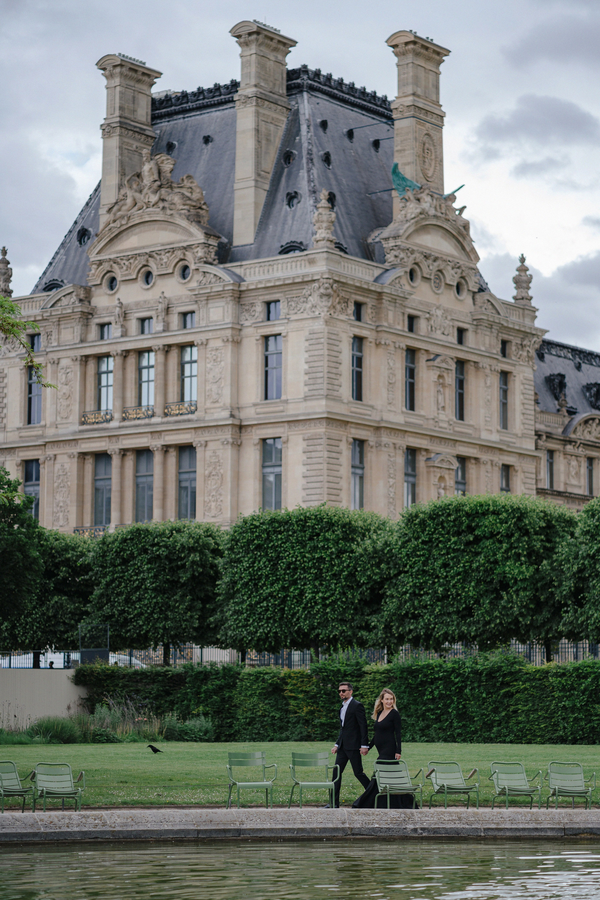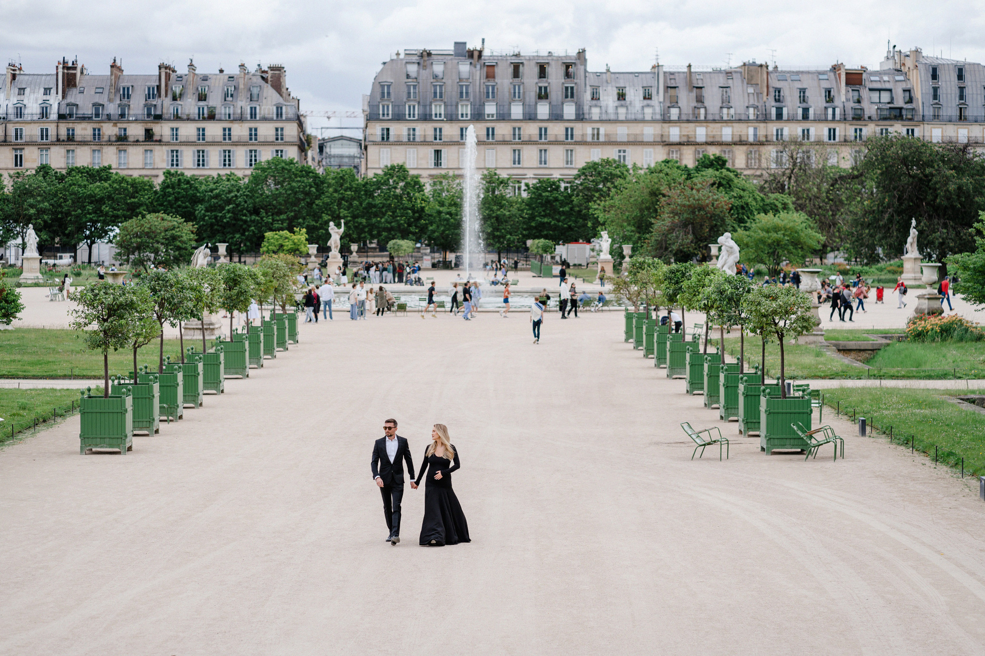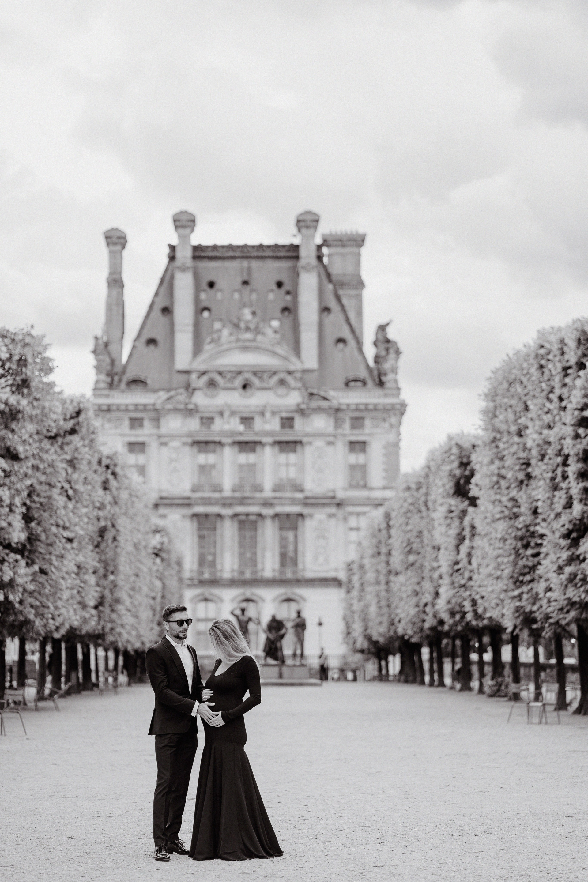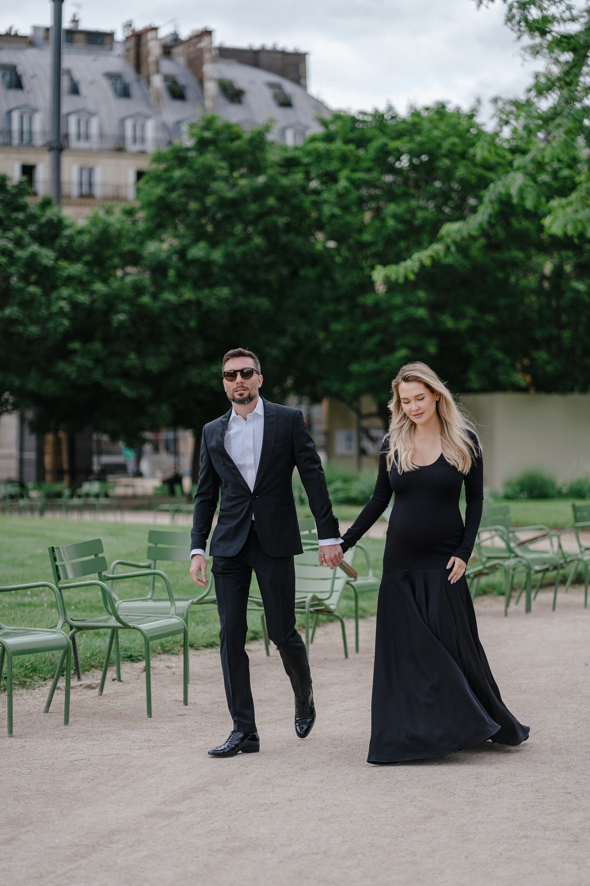 Майская съемка в саду Jardin des Tuileries — яркая зелень, мягкий свет и элегантная лаконичность силуэтов в черном. Особенное время в ожидании нового члена семьи в особенном для этой пары городе.