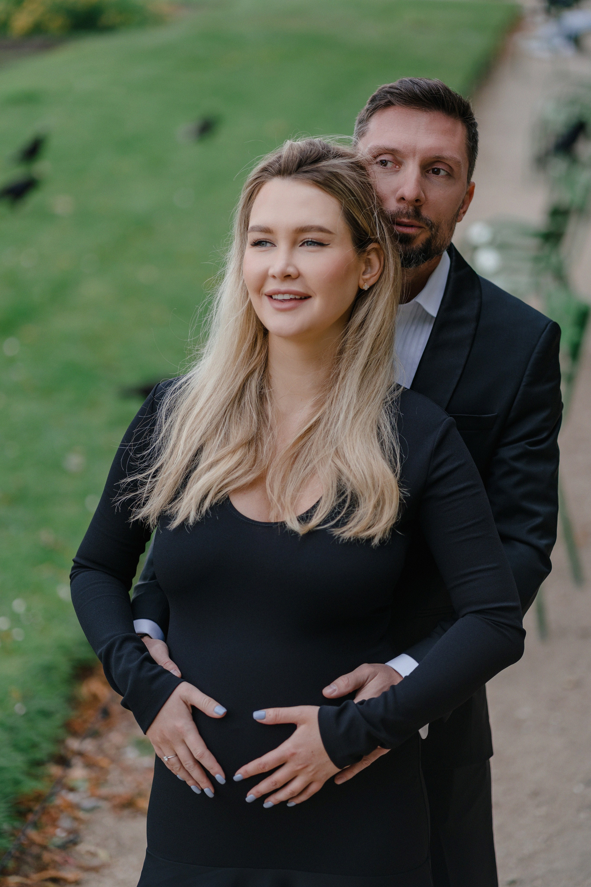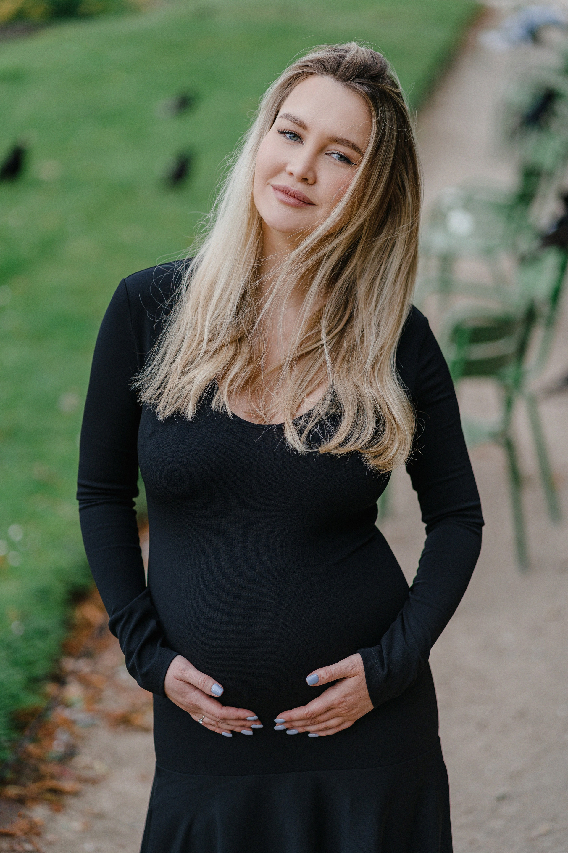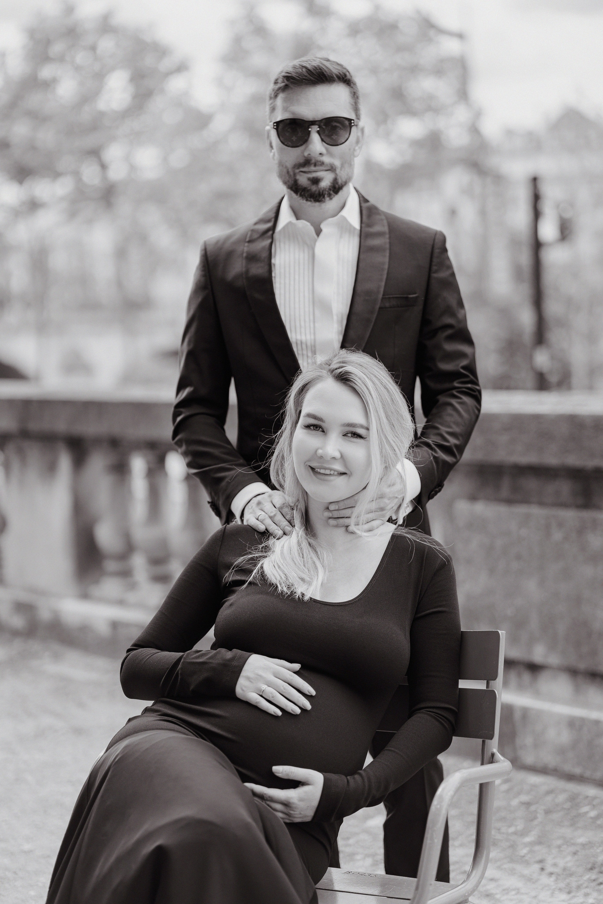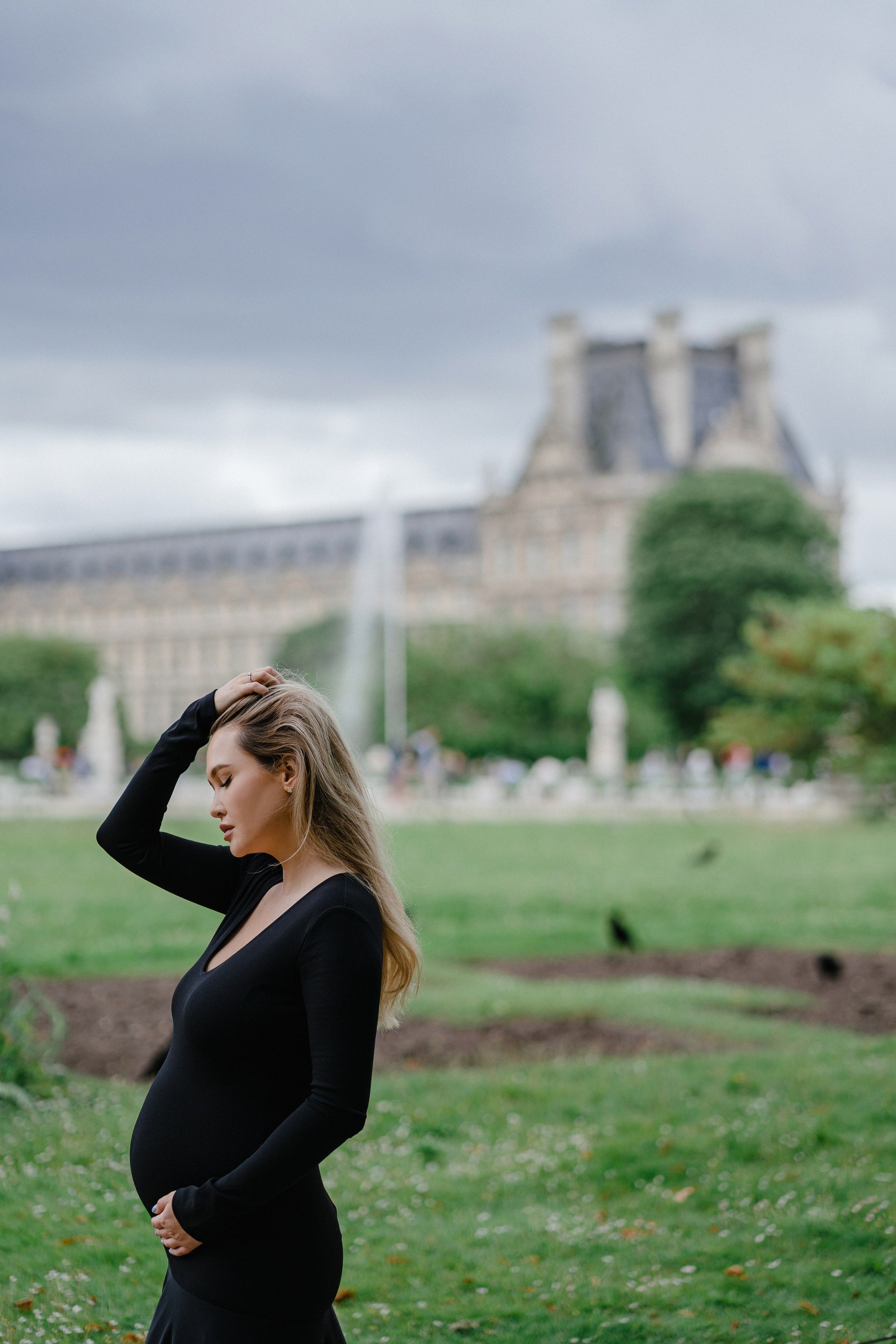Майская съемка в саду Jardin des Tuileries — яркая зелень, мягкий свет и элегантная лаконичность силуэтов в черном. Особенное время в ожидании нового члена семьи в особенном для этой пары городе.